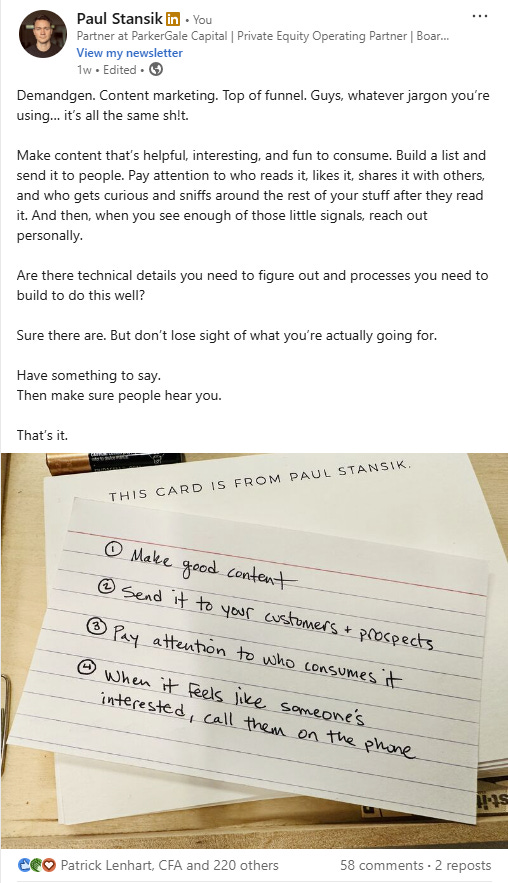 But if you’re just getting started, especially if you’re building marketing out from scratch, and if you’re looking for the highest ROI on a simple way to start talking to your potential customers and generating pipeline, here’s where I think you should start.